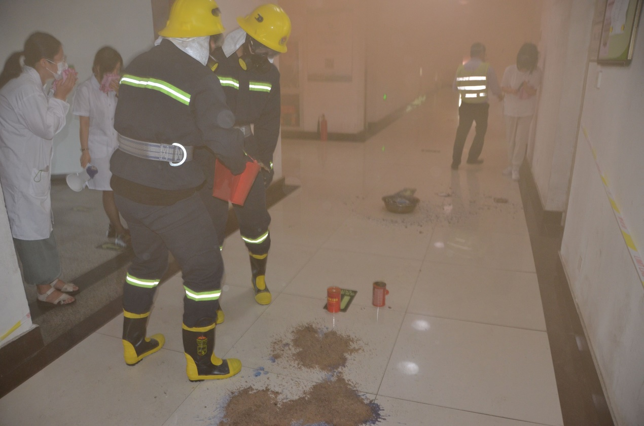 本次演练模拟领取危险化学品后不慎倒地并伴有火情烟雾,导致人员受伤被困、课程中断等事故场景。相关负责人接到指令后立即启动应急预案响应,积极开展救援和疏散工作。