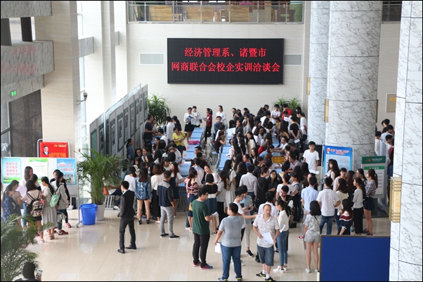 9月25日上午,经济管理系、诸暨市网商联合会校企实训洽谈会在学院图书馆大厅举行。经济管理系2012级毕业生参加洽谈会。