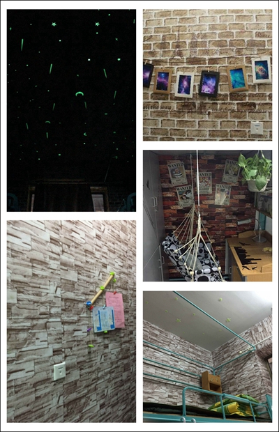 复古的红砖壁纸搭配欧式古典小吊椅,再搭饰一盘绿色盆栽,他们用自己的创意搭建了充满古镇气息的欧美式风情小园;绿色的剪纸小星星配上夜晚的神秘构建夜晚神秘星空世界,夜晚降临,可以抬头仰望那绿莹莹的星点,看那充满夜空气息的小园,伴着夜晚的宁静。爱在寝室,爱在小园。