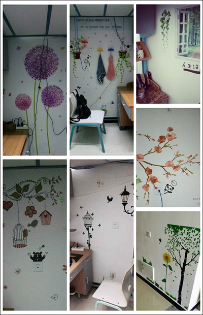 雪白的墙壁上,那艳目的蒲公英,那灿烂的向日葵,那耀眼的桃花,给寝室营造了一股阳光的氛围,鸟儿跃跃欲飞,无不为原本单调枯燥的寝室增添了一份自然的活力,他们用自然的元素去妆点韵律,用朴素的主题去回归自然。爱在寝室,爱在自然乐园。