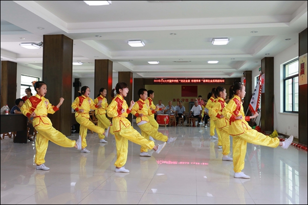 杨光为学院“全堂国术 非遗传承”暑期社会实践团授旗,至此,“全堂国术 非遗传承”大学生暑期社会实践团正式进驻枫桥镇全堂村。会后,实践团学习小组的成员观看了“全堂国术”精彩表演,开始国术学习。